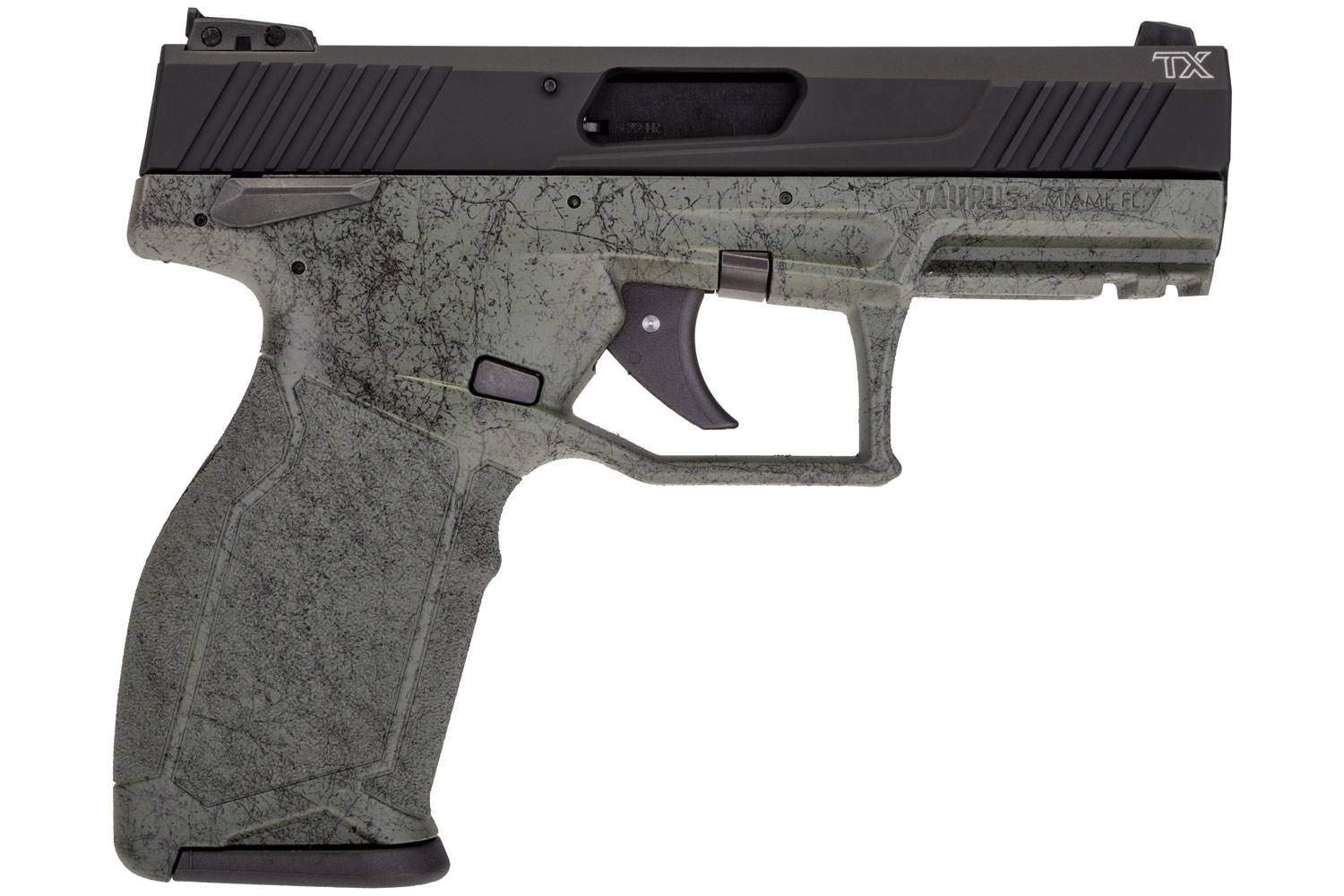 Green with Black Splatter, Polymer Frame, Black Annodized Aluminum Slide, SAO, 4.10" 1/2x28 Threaded Barrel, Manual Safety, Fixed Front and Adjustable Rear Sights, (2) 16 Round Magazines